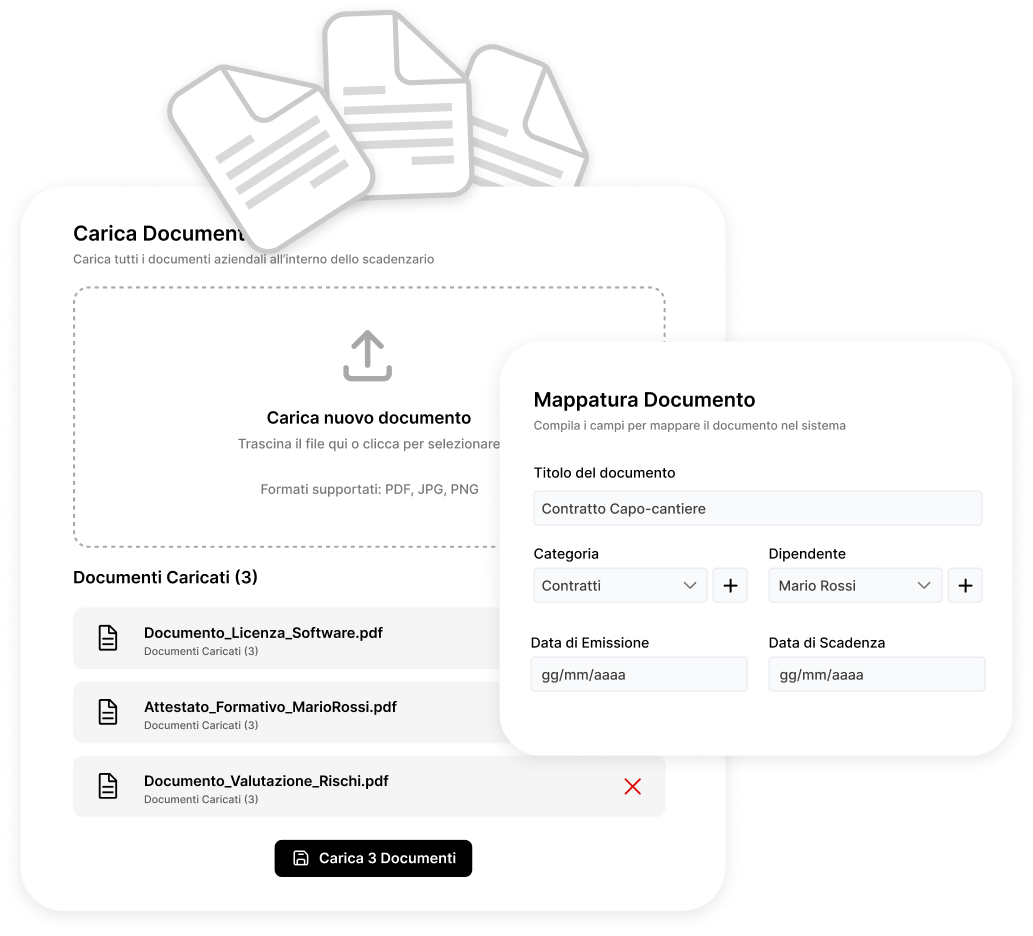 Carica centinaia di documenti in un’unica operazione. Durante l’importazione puoi mappare ogni file assegnando titolo, categoria, dipendente e date di emissione e scadenza, così tutto è subito organizzato e pronto all’uso.