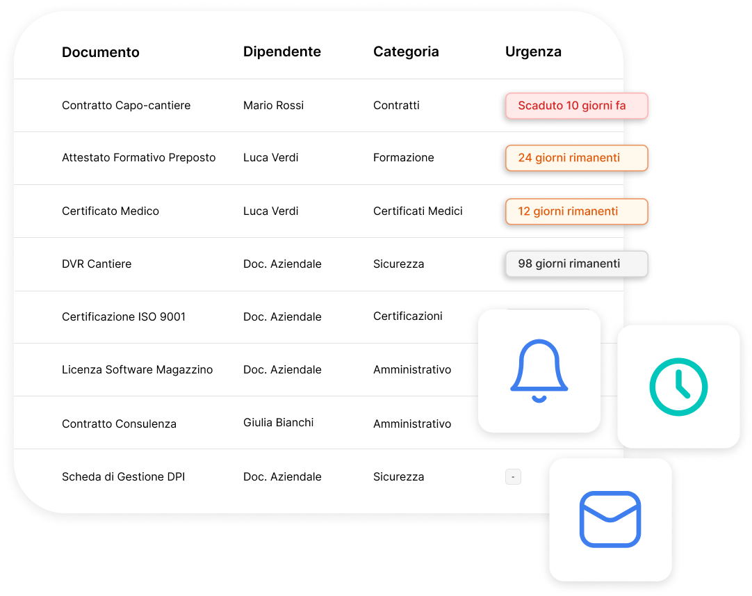 Ogni lavoratore ha un profilo chiaro: documenti, scadenze, e stato formativo basato sulla sua mansione e corsi assegnati. Nessuna duplicazione, nessun foglio Excel: tutto sempre allineato.